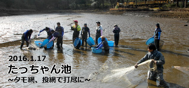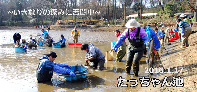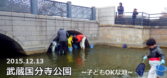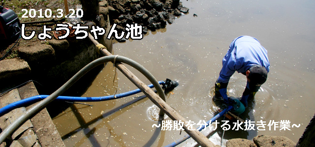 - しょうちゃん池は北山公園(東京都東村山市)の中にある人工の池です。春先から夏にかけては、ポンプアップされた北川の水が北山公園内を流れてしょうちゃん池に注ぎこまれます。そのため北川と同じようないきものが生息しています。池の底はコンクリートで固めてあるので、池の水をうまく落とせれば、安全にかいぼりができます。2010年,18年に実施しています。北川からの流入のない冬場でも八国山からの湧水が流れ込んでいるので、排水がうまくできるかが大きなポイントになります。