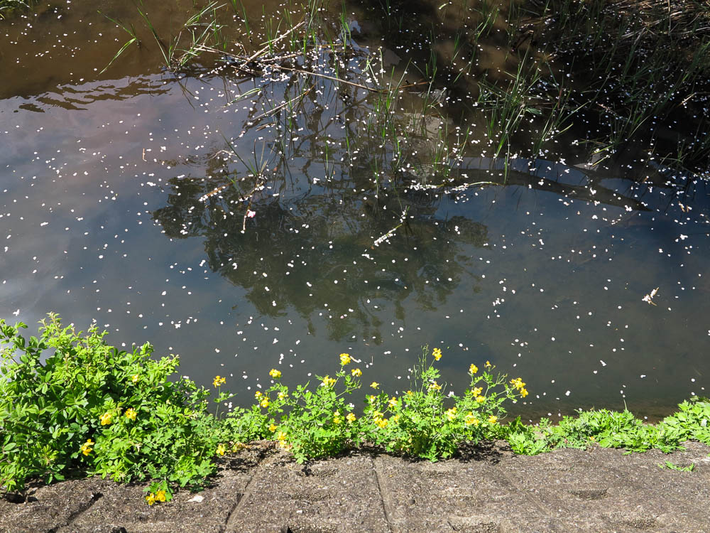 川周囲のサクラは散り時