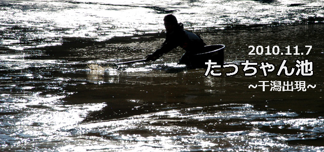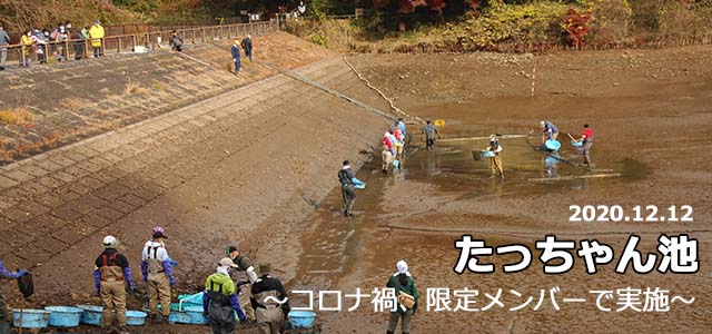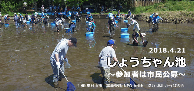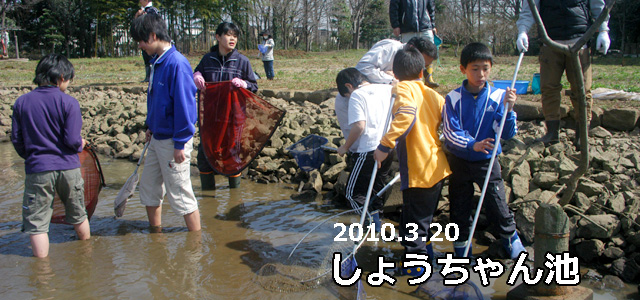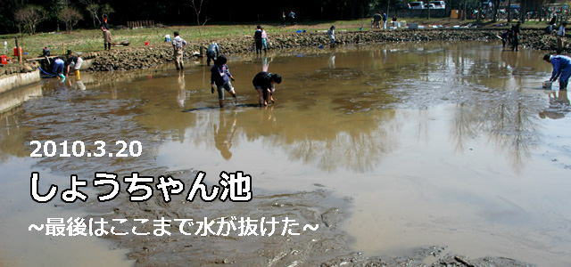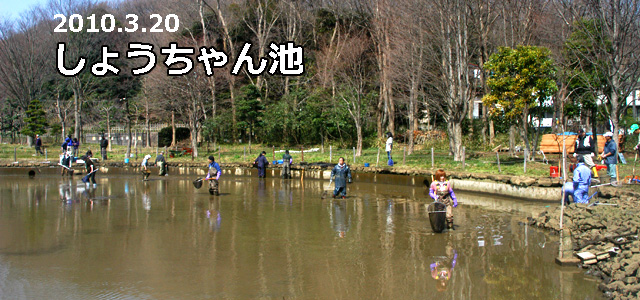 - しょうちゃん池は北山公園(東京都東村山市)の中にある人工の池です。春先から夏にかけては、ポンプアップされた北川の水が北山公園内を流れてしょうちゃん池に注ぎこまれます。そのため北川と同じようないきものが生息しています。池の底はコンクリートで固めてあるので、池の水をうまく落とせれば、安全にかいぼりができます。2010年,18年に実施しています。北川からの流入のない冬場でも八国山からの湧水が流れ込んでいるので、排水がうまくできるかが大きなポイントになります。